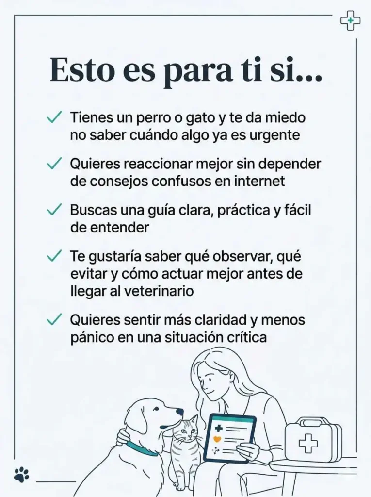 Con enfoque práctico y lenguaje claro, para ayudarte a reaccionar con más criterio cuando tu perro o gato más te necesita.